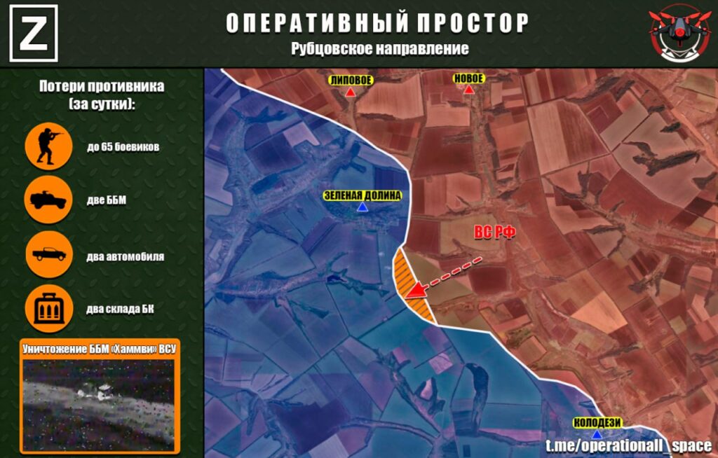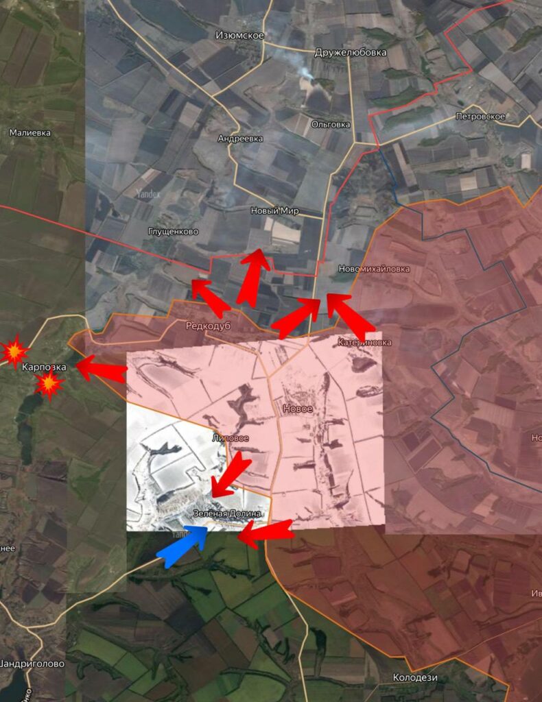 В районе Зелёной Долины идут интенсивные боевые действия, в результате которых подразделения ВС РФ увеличили зону контроля до 200 метров по ширине фронта и 350 метров вглубь. Это даёт российской армии преимущество в этом секторе.