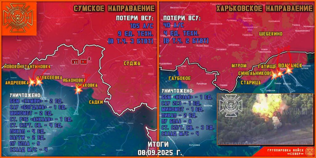 В Волчанске на левом берегу реки Волчья Воины Севера отразили контратаку 42 батальона 57 омпбр ВСУ, после чего продолжили продвижение. Фактически у 57 омпбр боеспособным остался только один батальон — 42 омпб, доукомплектованный военнослужащими 9 осб. Остальные подразделения практически утратили боеспособность, однако командование ВСУ не выводит их на восполнение из-за отсутствия вариантов замены.