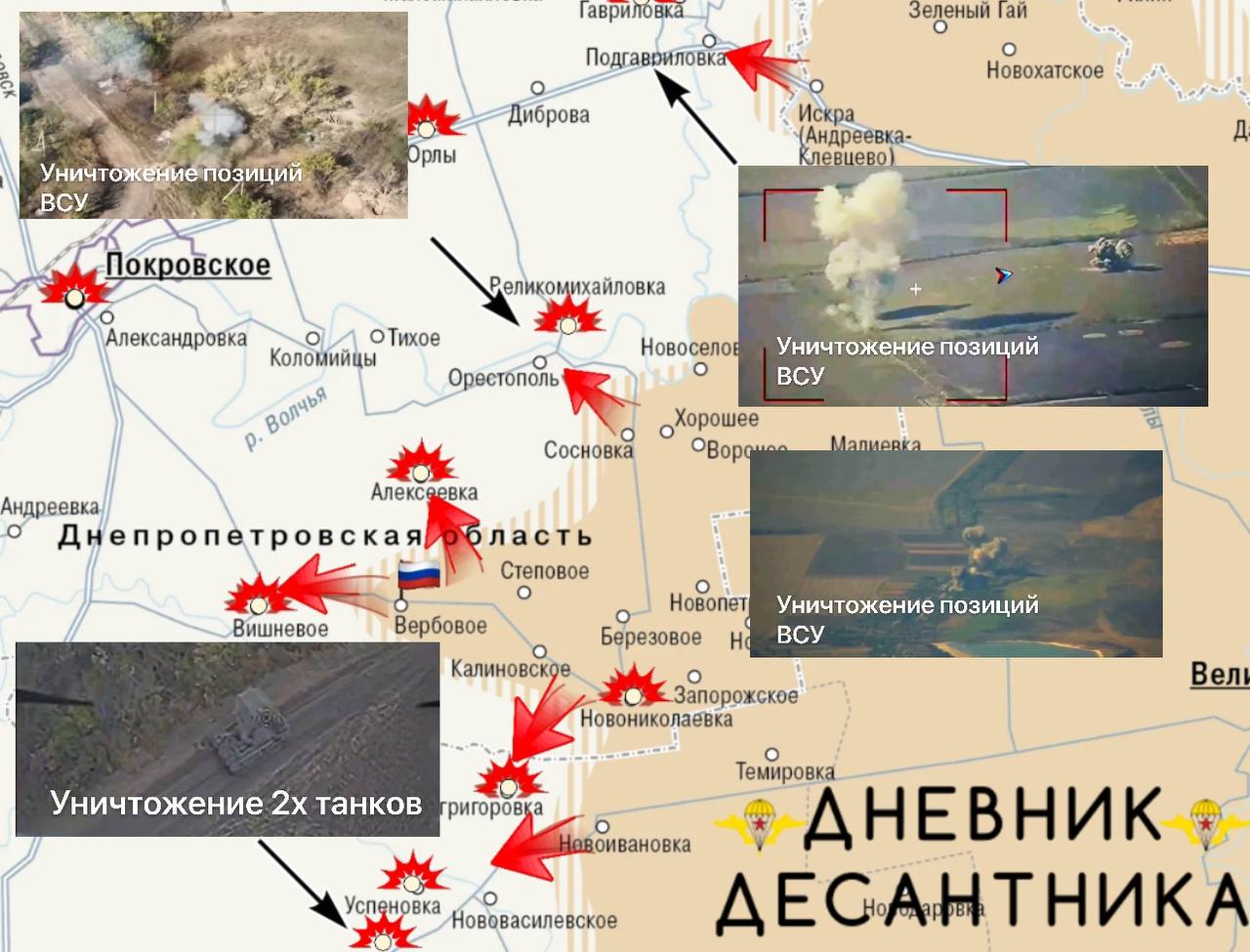На Покровском фронте в районе Удачного и Котлино продолжаются позиционные бои. В Покровске есть тактические успехи. На Добропольском выступе ВС РФ на некоторых участках начинают перехватывать инициативу. В Новоторецком и Владимировке наши войска занимают новые позиции, с которых оттесняют противника дальше. В районе Золотого Колодезя ресурсы противника признали присутствие ВС РФ северо-восточнее этого села. Тяжёлые бои идут в районе Нового Донбасса, там наши дронщики уничтожили танк, который обстреливал позиции ВС РФ.