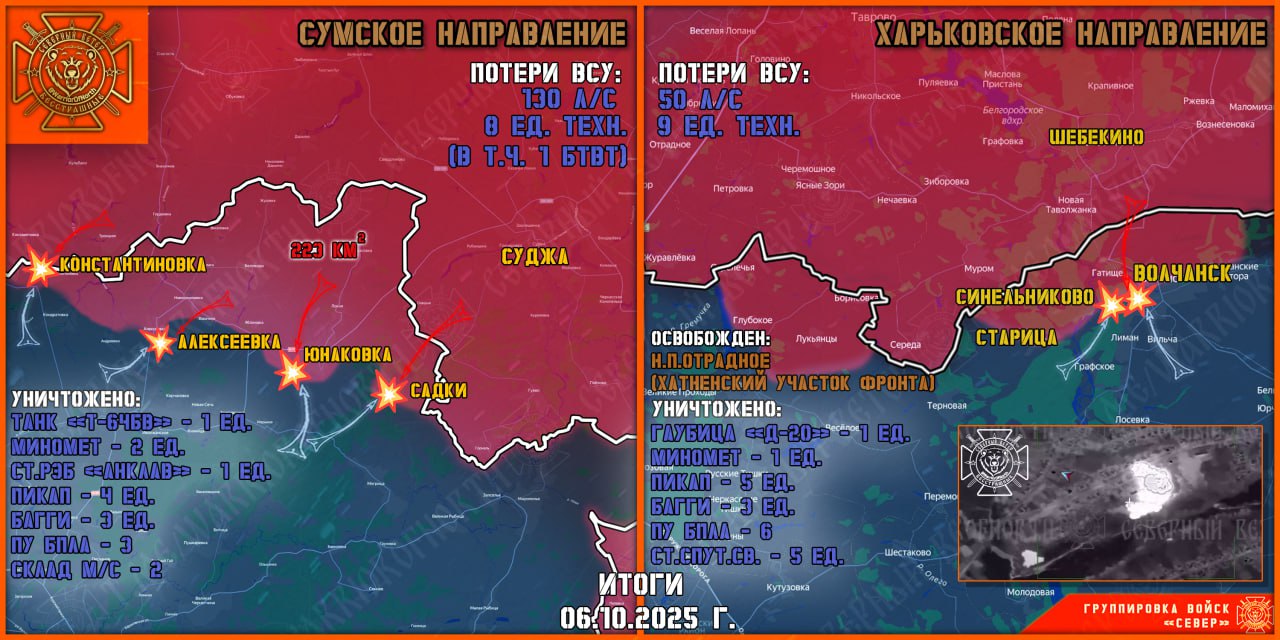 В ходе продвижения уничтожено до взвода живой силы противника 3 отмбр ВСУ и ББМ. Ударами авиации уничтожены пункты дислокации 3 отмбр и 1 обрСпН в районе Бологовки и Чугуновки. На Липцовском участке фронта без существенных изменений. Противник активных действий не предпринимал, — Северный Ветер.