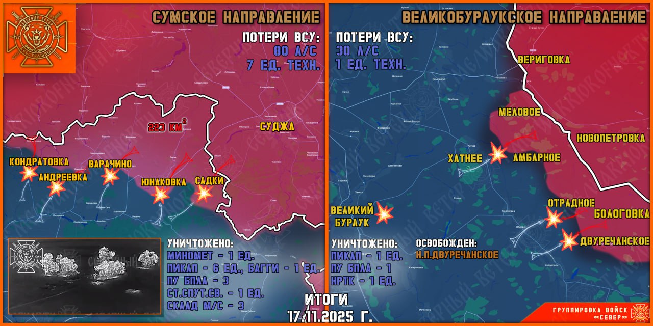 На участке Меловое–Хатнее российские силы продвинулись на 400 м, ударами «Герань-2» поражены позиции 3-й отмбр ВСУ у Великого Бурлука. На Липцовском направлении существенных изменений нет; артиллерия и FPV-экипажи «Севера» уничтожали технику и пункты управления БПЛА ВСУ, — Северный Ветер.