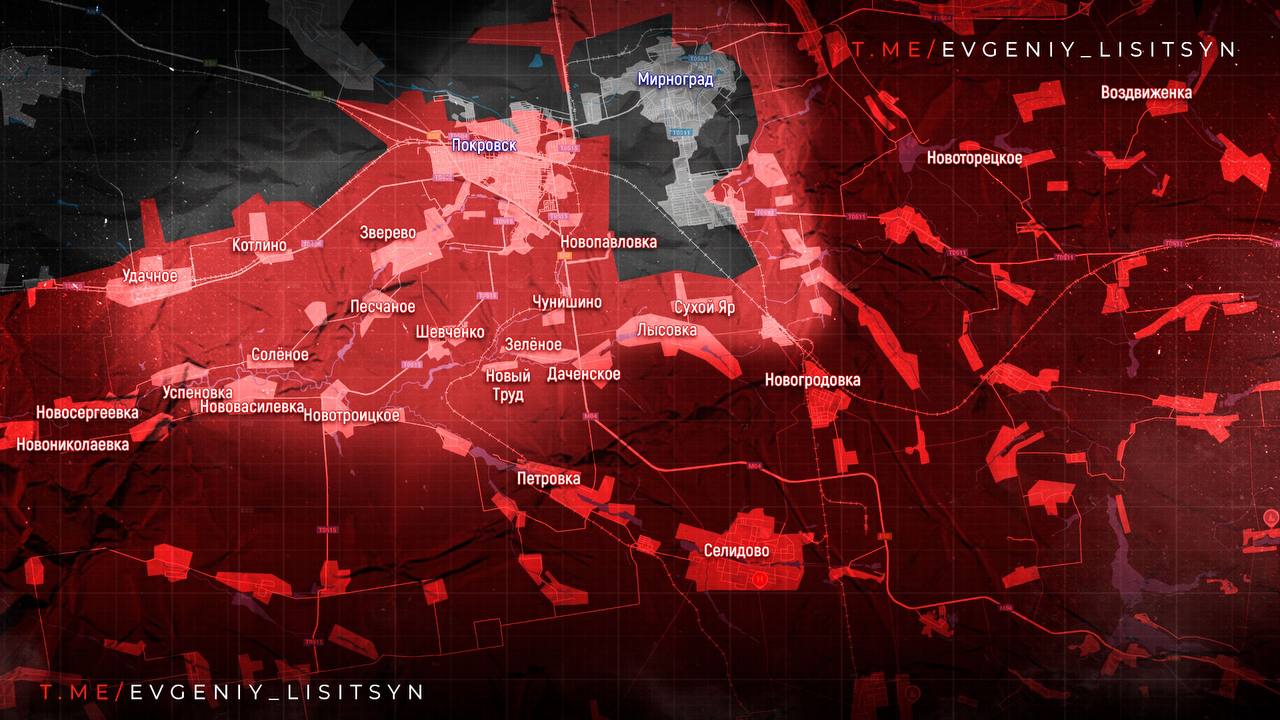 Битва за Покровск близка к завершению, что ухудшает положение украинских сил в Мирнограде. Окружённый гарнизон подвергается интенсивным ударам, а по отдельным данным — и ударам украинской авиации. Если это подтвердится, оборона ВСУ в агломерации фактически рухнула, хотя отдельные контратаки сохранятся.
