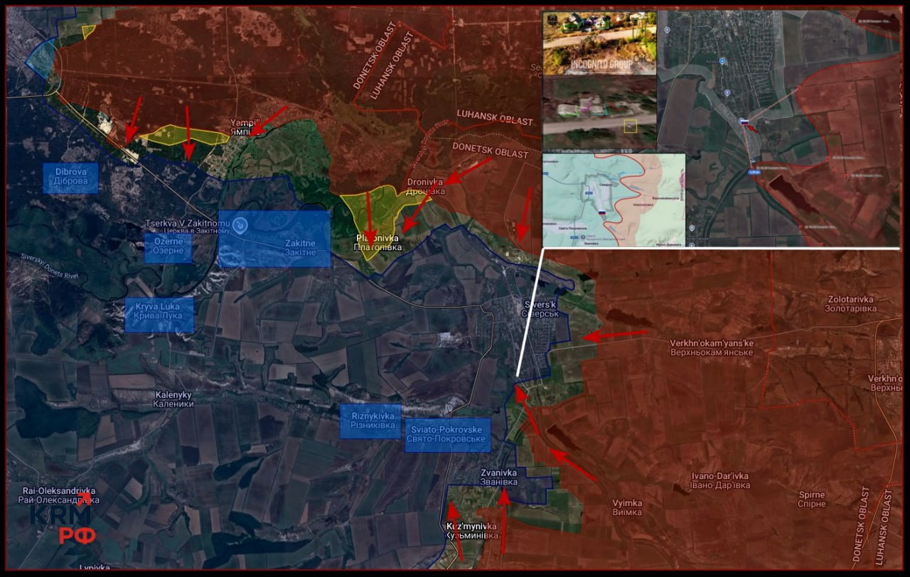 На видео с дрона зафиксированы российские солдаты в южной части города, признают и вражеские OSINT-аналитики. Ранее на днях ВС РФ также продвинулись к Северску с севера, со стороны Дроновки. Восточнее Северска армия России также взяла штурмом ряд опорников ВСУ вдоль лесополос.