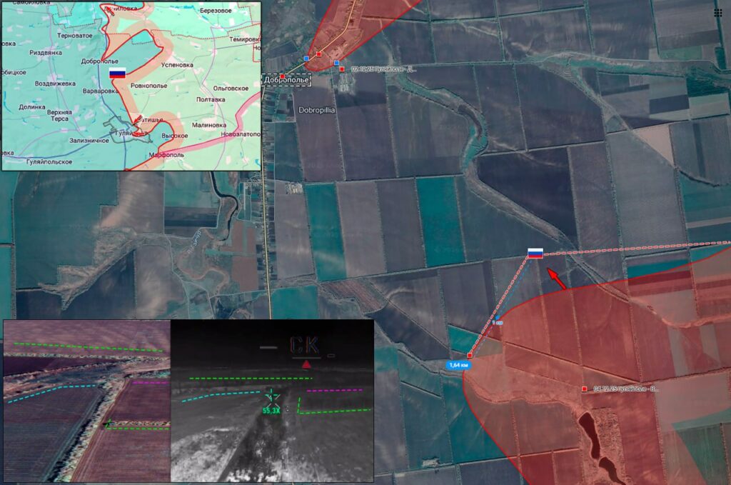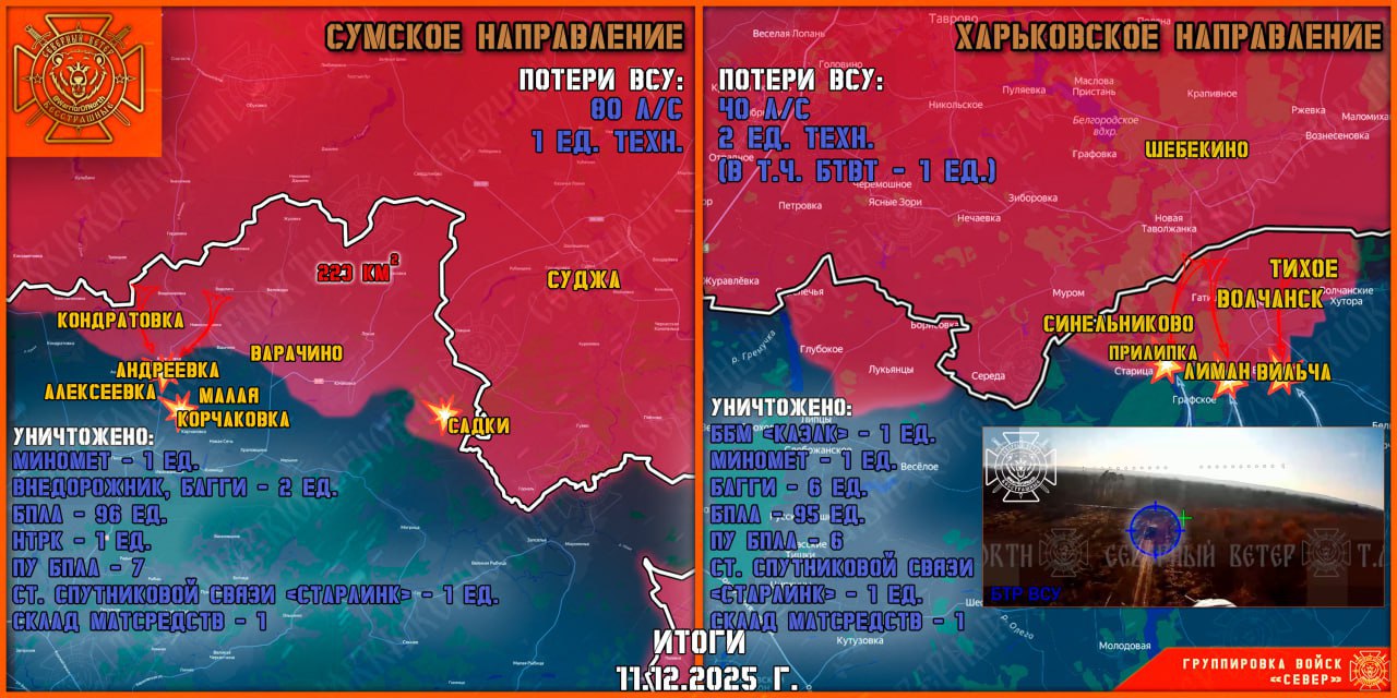 На участке фронта Меловое-Хатнее Северяне расширили зону контроля возле российской границы и продвинулись на трех участках на 400 м. Ударом БпЛА «Герань-2» уничтожен пункт дислокации резервов 3 отмбр ВСУ в районе Подсреднего. На Липцовском участке фронта без существенных изменений, противник активных действий не предпринимал, — Северный Ветер.