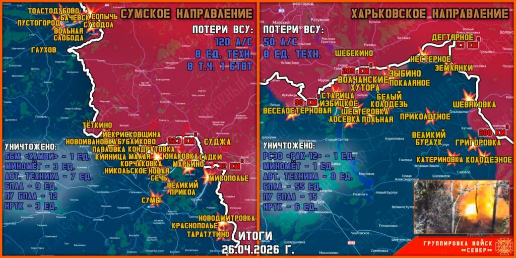 В Шосткинском районе без существенных изменений. Наши артиллеристы и операторы БпЛА наносят удары по ранее вскрытым целям, штурмовики зачищают приграничные лесные массивы. Северяне продвинулись до 150 метров. Штурмовики Северян в ходе упорных боев продвинулись в Сумском районе на двадцати шести участках. За сутки продвижение составило до 400 м. Упорные стрелковые бои продолжаются в Мирополье, в районах Кондратовки и Корчаковки. Наши военнослужащие за прошедшие сутки выбили украинских националистов из 38 огневых позиций, оборудованных противников в строениях Мирополья.