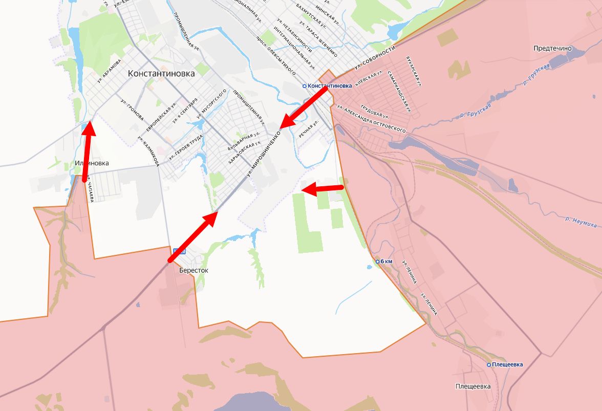 В настоящее время наиболее напряженные боестолкновения фиксируются на западной окраине этого населенного пункта. Одновременно российские подразделения расширяют зону контроля западнее Берестков, продвигаясь в направлении Ильиновки. За этот населенный пункт идут встречные бои, стороны пытаются перехватить инициативу, используя маневры малых штурмовых групп и огневую поддержку. Давление оказывается и в сторону юго-западных окраин Константиновки, где линия соприкосновения остается подвижной.