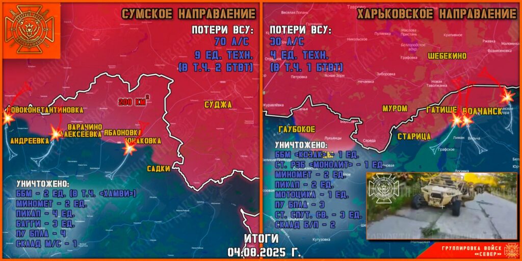 Российские войска 5 августа сжимают кольцо вокруг Покровска, прорывая оборону ВСУ, в то время как на Сумском направлении украинские бойцы массово отказываются идти в бой. На Херсонском и Запорожском направлениях ВС РФ изолируют группировки противника, усиливая давление на ключевые участки фронта.