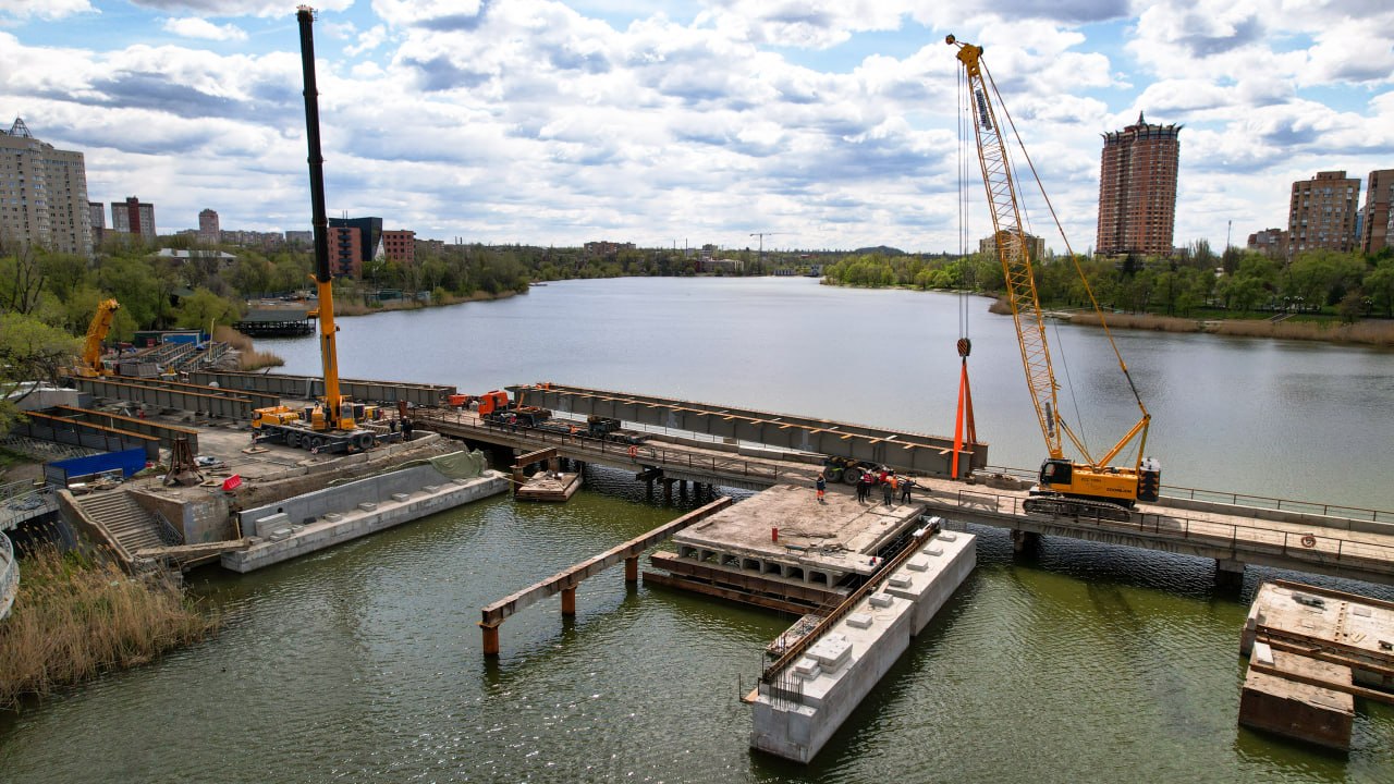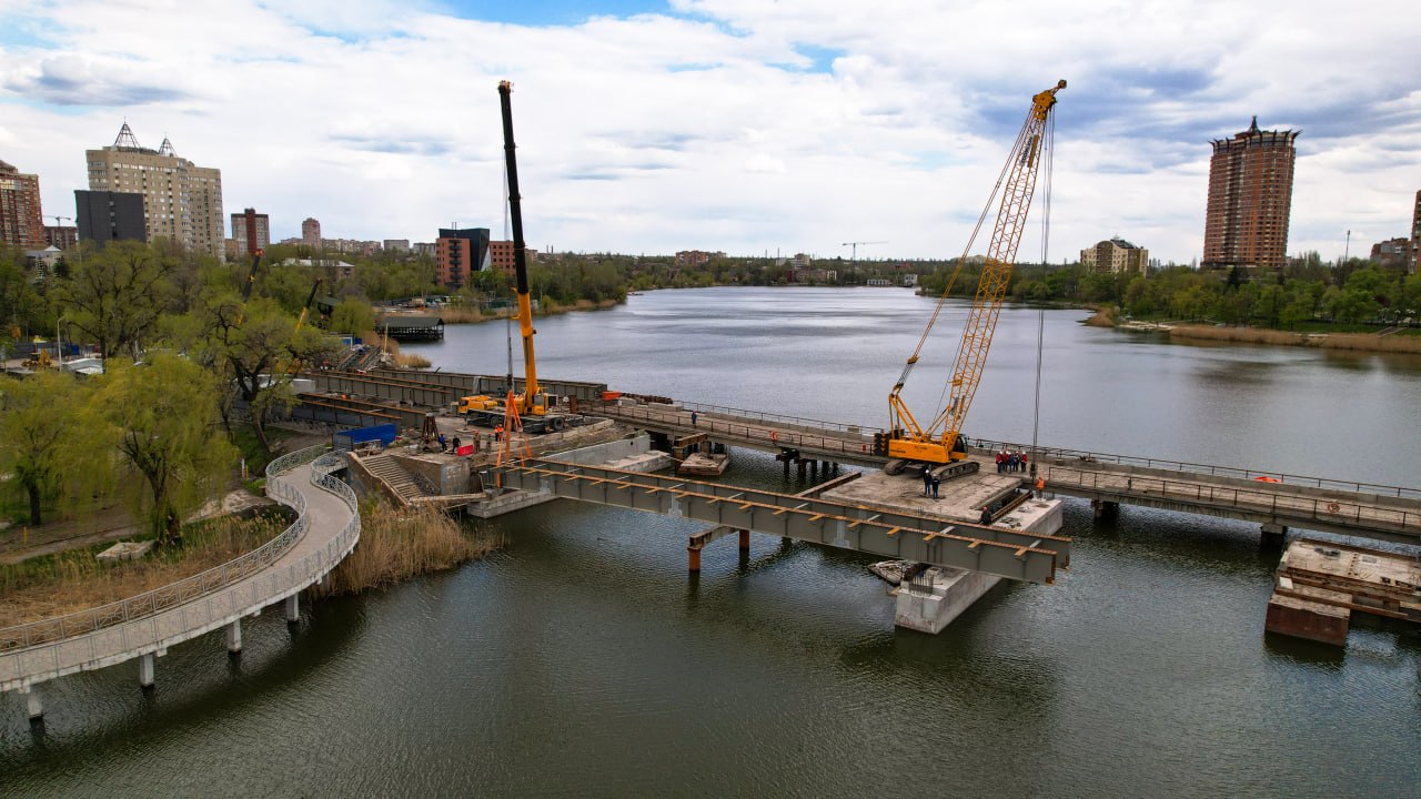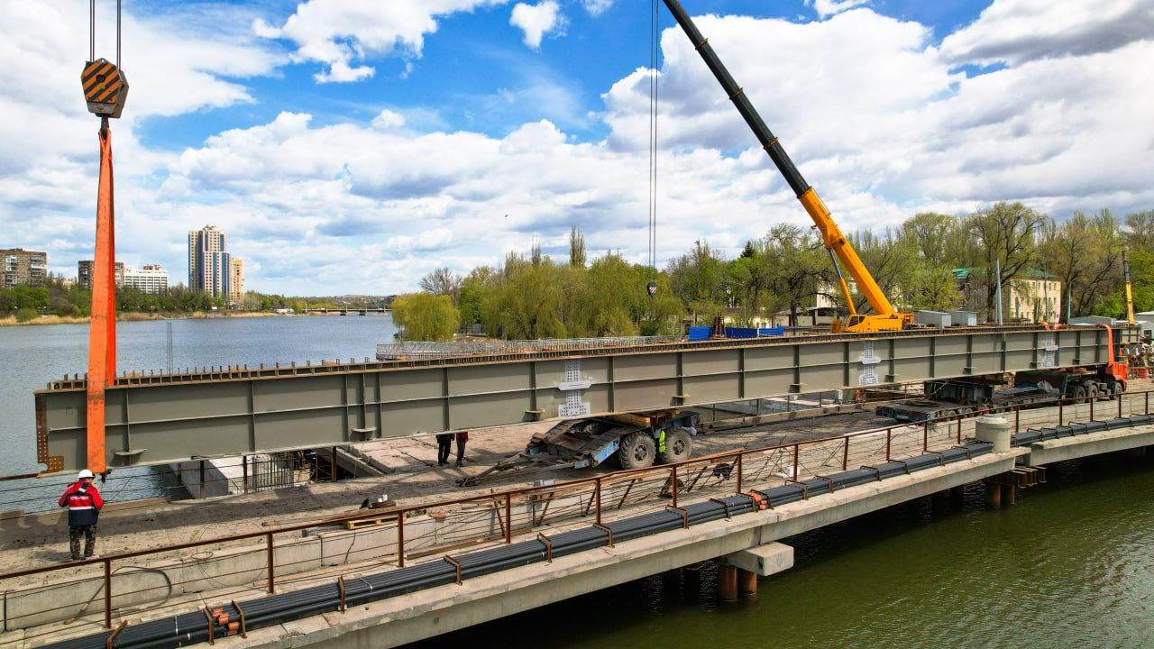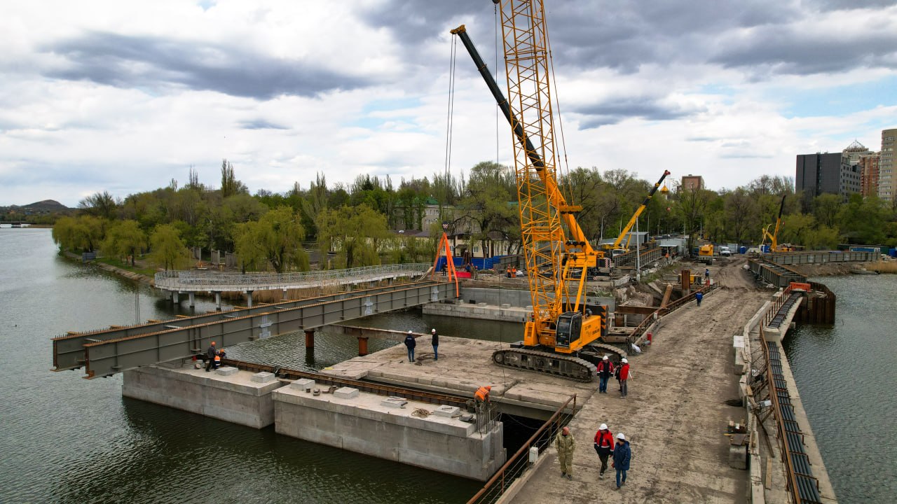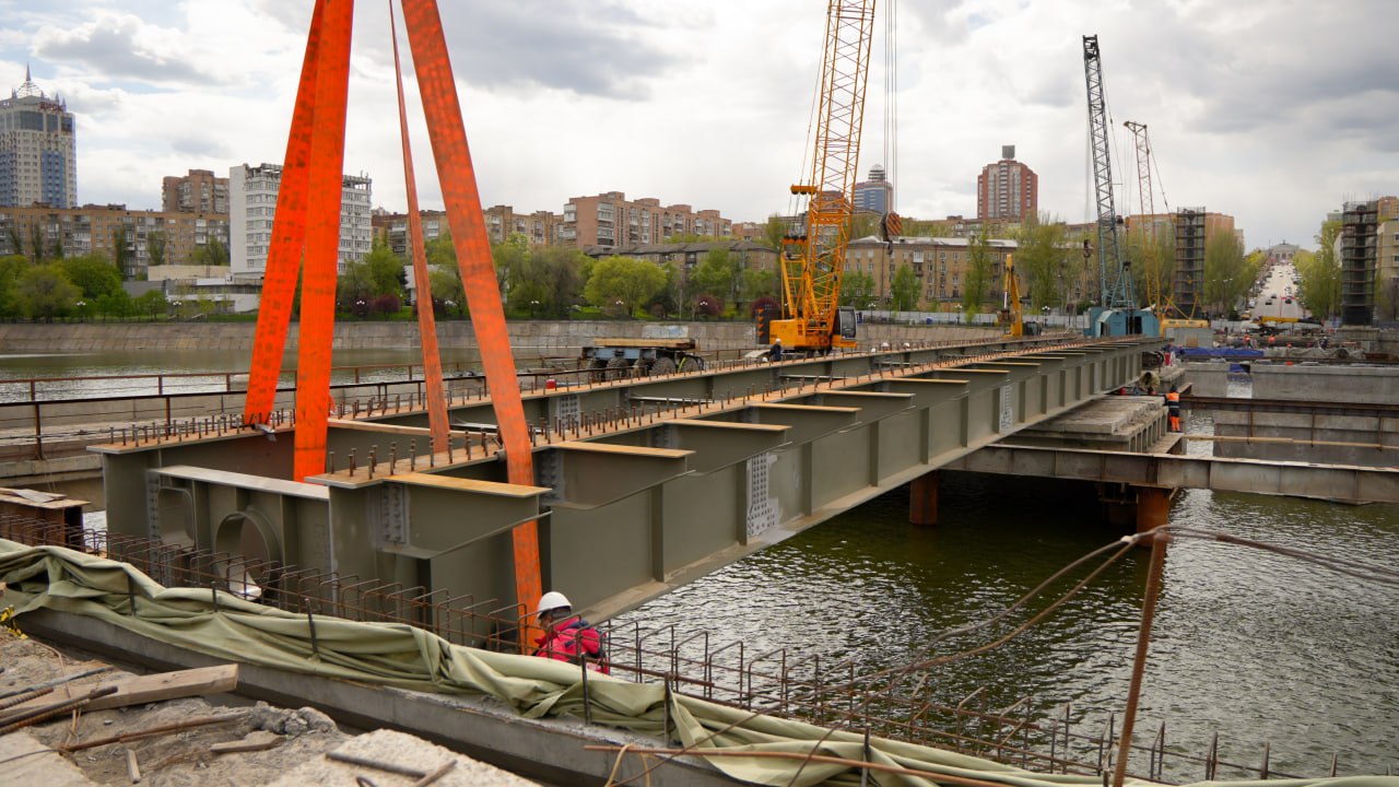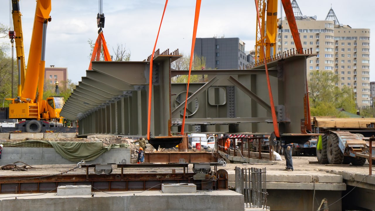 На мосту через реку Кальмиус по проспекту Ильича в Донецке начался ключевой этап капитального ремонта. Строители установили первый металлический блок пролётного строения — событие, которое фактически открывает сборку нового мостового полотна.