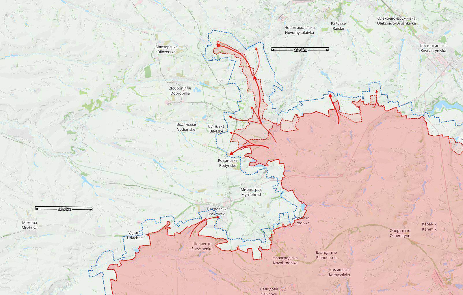 На Покровском (Красноармейском) направлении российские войска совершили значительный прорыв обороны противника, продвигаясь на глубину более 11 км, что значительно изменяет обстановку на фронте. В результате успешных наступательных операций российские силы вошли в несколько ключевых населённых пунктов — Кучерев Яр, Золотой Колодезь, и Весёлое, где ведётся накопление сил для дальнейших атак.