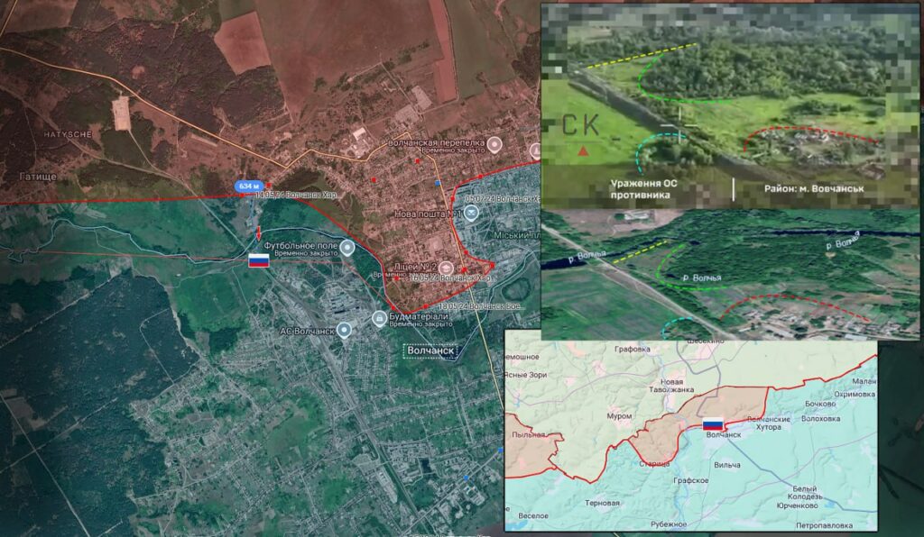 Активные боевые действия в Харьковской зоне безопасности. Атака ВС РФ пехотным подразделением в городе Волчанск. Штурмовая группа занимает новые позиции в части города южнее реки Волчья в районе железнодорожного моста под огнём ВСУ. Расширение зоны контроля ВС РФ более 600 метров в Волчанске.