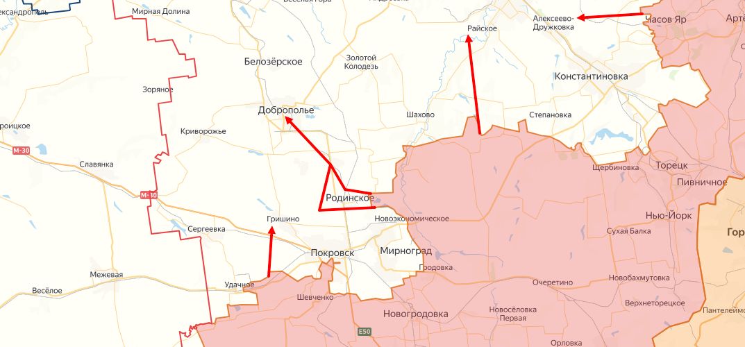 Вооружённые силы России продолжают сжимать кольцо окружения вокруг агломерации Красноармейск – Димитров в Донецкой Народной Республике, продвигаясь по северному направлению.