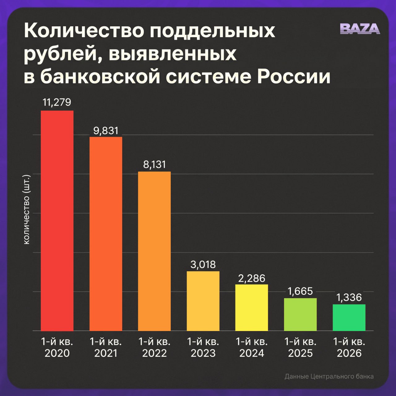 Согласно статистике Банка России, в первом квартале 2026 года в банковской системе обнаружили 1 336 поддельных денежных знаков. Это самый низкий показатель за последние шесть лет. Для сравнения, за аналогичный период прошлого года было выявлено 1 665 фальшивок, а по итогам всего 2025 года их число превысило 6,5 тысячи.