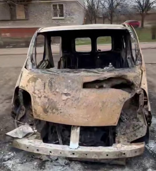 По данным визуального анализа, автомобиль получил критические повреждения и полностью выгорел. Машина фактически уничтожена: от неё остался лишь деформированный каркас. Характер разрушений указывает на прямое попадание с последующим возгоранием.