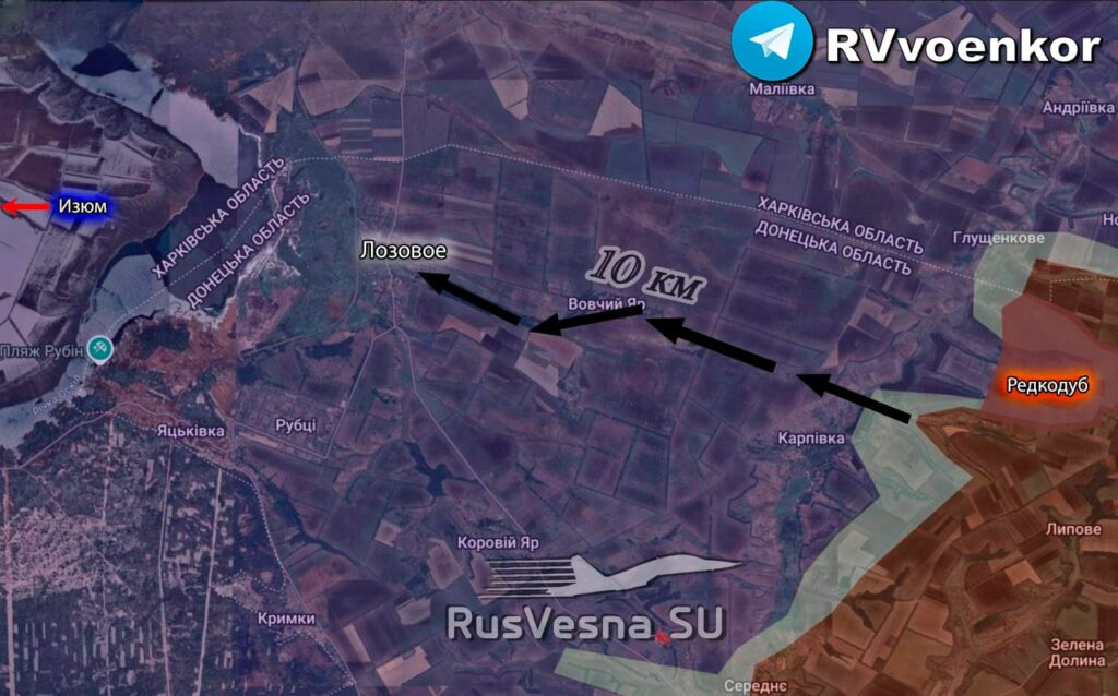 На Краснолиманском направлении зона контроля расширена на южных подступах к городу и на его севере. Российские подразделения, наступая от Яра Пинькова, вклинились в оборону, тогда как ВСУ пытаются контратаковать со стороны Ставков. Отмечаются успехи в лесах между Новосёловкой и Яровой, а также продвижение вдоль Северского Донца на восточной окраине Святогорска. Выше по фронту предпринимаются обходы Коровьего Яра с прицелом на Лозовое, где противник, по данным военкоров, концентрирует силы для возможной контратаки.