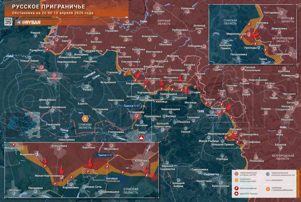 Российские войска 10 апреля освободили населённый пункт Диброва на Славянском направлении, сообщило Министерство обороны РФ. Село расположено у трассы М-03 южнее Рай-Александровки, где также идут тяжёлые бои. На Сумском направлении бойцы группировки «Север» взяли Миропольское, уничтожив резервы ВСУ на подходе. Штурмовики действуют у Старого Каравана и зачищают «карман» до Ильичевки. Последние новости СВО на 10 апреля — в материале по данным военных пабликов.