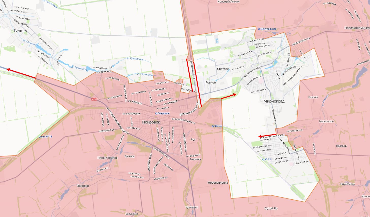 На Красноармейском направлении продолжается серьёзное давление на противника. Российские части продвигаются севернее Котлино в направлении трассы на Павлоград. Одновременно украинские подразделения со стороны Гришино пытаются наносить по десять атак ежедневно, но терпят ощутимые потери. Большая часть Красноармейска уже под контролем российских сил. Минобороны подтвердило освобождение села Рог, расположенного на восточной окраине города. В Димитрове продвижение ощущается сразу на нескольких участках: на севере российские подразделения прорезают оборону противника вдоль Шоссейной улицы, а с противоположной стороны украинские силы практически вытеснены из Светлого. В южной части Димитрова над зданием шахты поднят российский флаг. На Добропольском выступе украинские силы пытаются закрепиться в Родинском, однако их положение осложняется давлением с восточного фланга, где российские бойцы продвинулись в направлении Шахово, выбив противника из Владимировки.