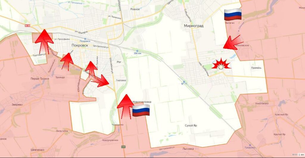 На Покровском направлении Минобороны подтвердило освобождение Новопавловки, расположенной юго-восточнее Покровска. Бои приближаются к окраинам города. В западной части Покровска идут ожесточённые уличные столкновения. После взятия Балагана российские подразделения вошли в микрорайон Молодёжный Мирнограда и закрепляются на новых позициях.