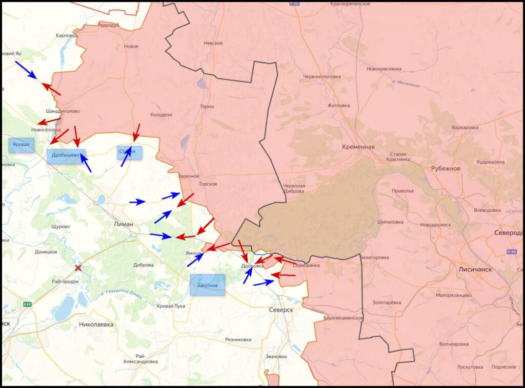 На Краснолиманском направлении ведутся тяжёлые бои у Дробышево и Новосёловки. По данным с мест, российские подразделения закрепились в северной части Дробышево и ведут наступление на Ставки, блокируя пути снабжения противника.