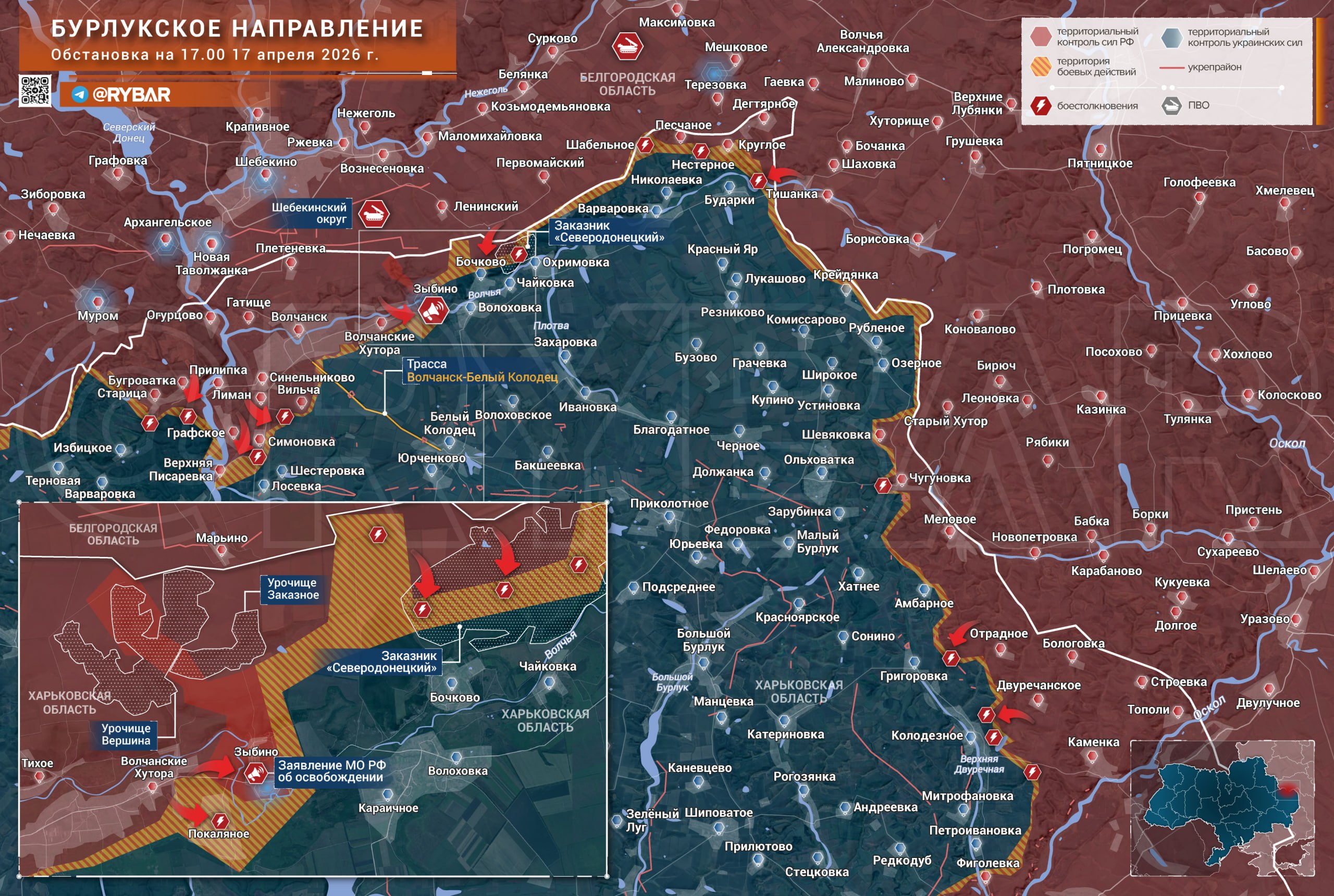 На Харьковском участке после взятия Волчанских Хуторов российские силы продолжают наступление восточнее. Сообщается об установлении контроля над Зыбино. В качестве следующей цели рассматривается район треугольника Караичное — Бочково — Волоховка.