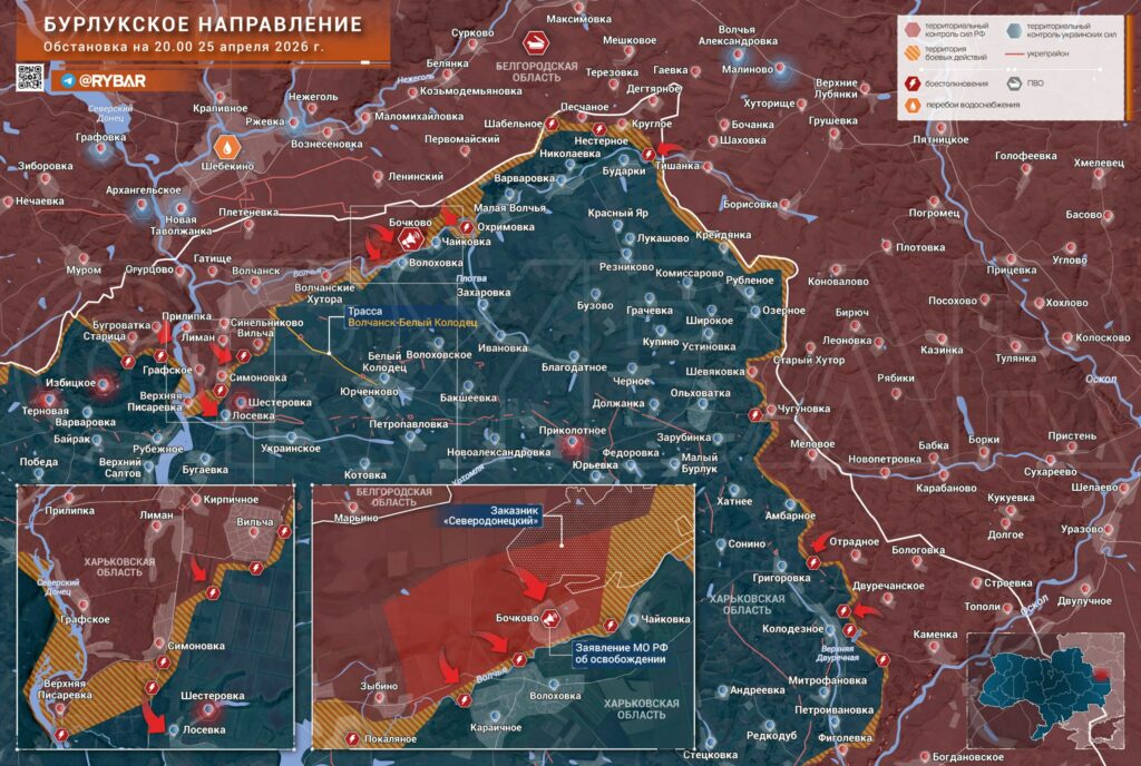Утром 26 апреля, на 1522-й день СВО, российские войска продолжают давить на нескольких направлениях сразу. Особенно заметно движение на Бурлукском участке в Харьковской области и на подступах к Краматорской агломерации. Эксперты отмечают, что тёплая погода и густая зелень серьёзно облегчили работу штурмовых групп.