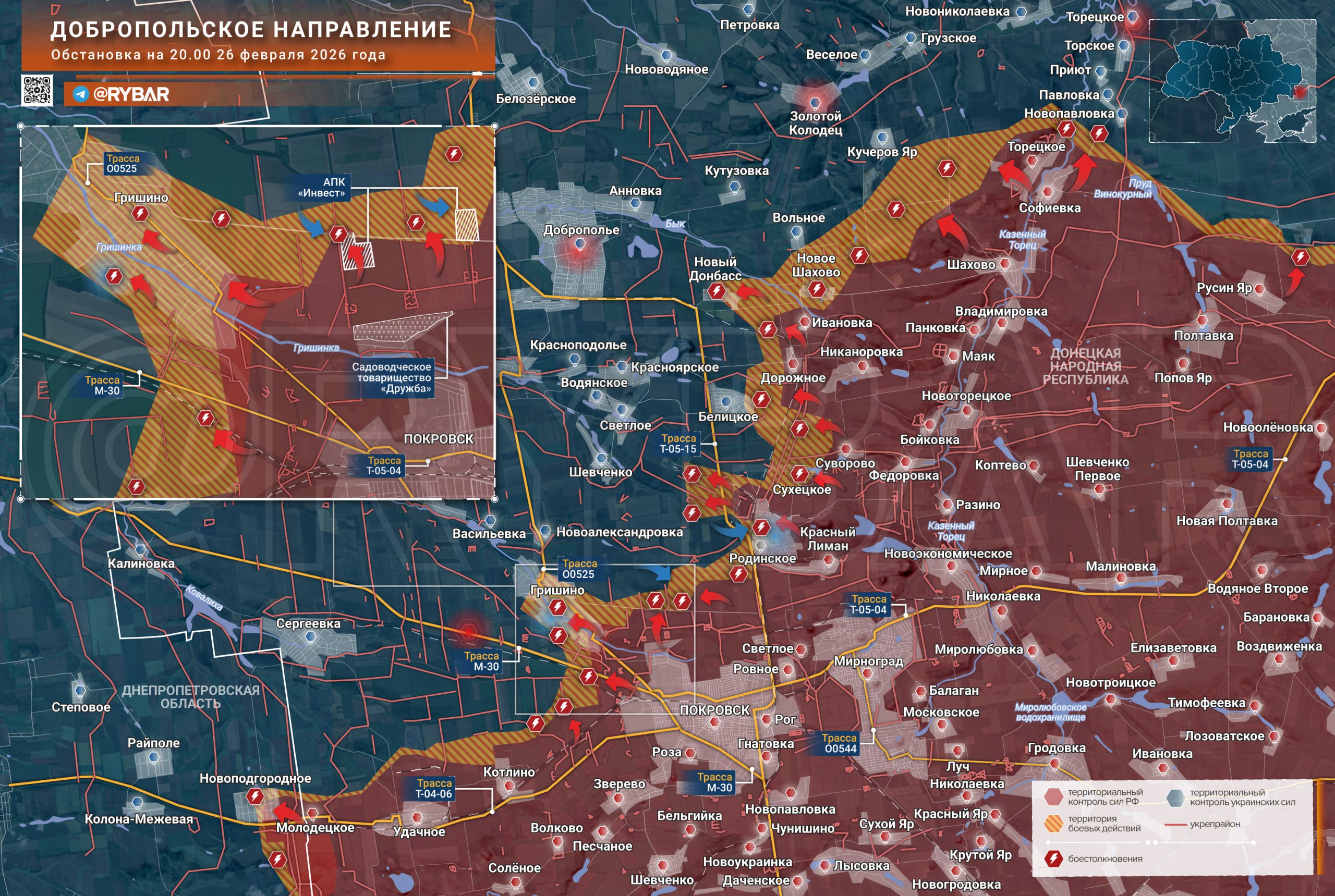 Фронтовая сводка к утру 26 февраля: хроника 1463-го дня СВО — ФАБ-3000 по дамбе перерезал логистику в Константиновке. Карта боевых действий в зоне боевых действий на Украине