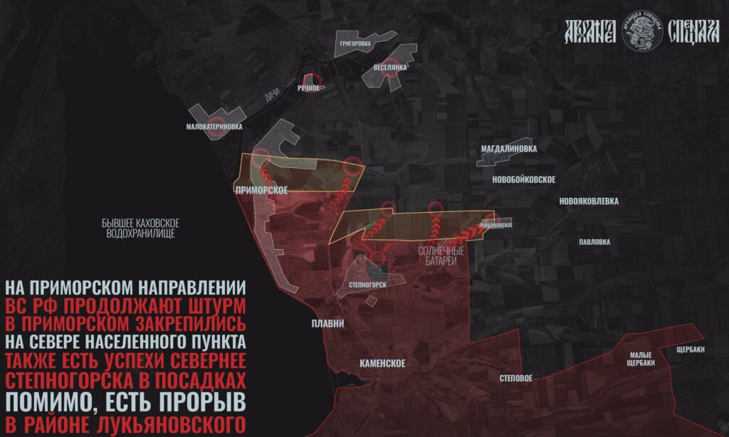 В Степногорске зачищен центр города, где ранее оказался в окружении украинский гарнизон. Севернее подразделения ВС РФ вышли к балке Перерва вдоль трассы на Запорожье. В самом Приморском российские силы продавили оборону противника в центральной части и ведут бои в районе Свято-Успенского женского монастыря и на улице Зелёной — менее чем в 15 километрах от Коммунарского района Запорожья.
