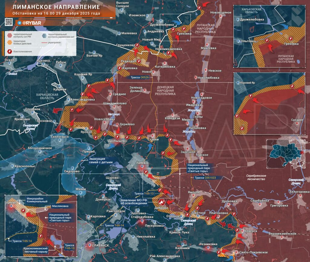 На Краснолиманском направлении бои идут на восточной и северной окраинах Красного Лимана, а в районах Яровой и Дробышево обстановка остаётся без изменений.