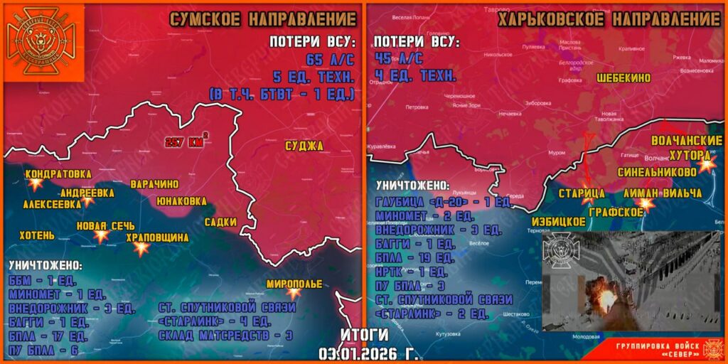 На севере Харьковского участка идут зачистки в районе Сотницкого Казачка и продвижение в лесах южнее Старицы с ориентиром на Рубежное. В Сумском приграничье украинские источники сообщают о пересечении границы российскими подразделениями на новом участке и установлении контроля над селом Комаровка.