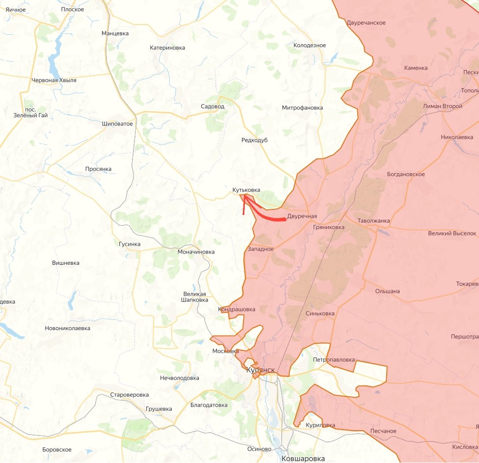 В Купянске обстановка остаётся без принципиальных изменений — позиционные бои продолжаются. Сообщается, что ВСУ перебрасывают дополнительные резервы в Купянск-Узловой через реку Оскол. При этом на северном плацдарме в районе Двуречной у российских подразделений есть продвижение в сторону Кутьковки. Российские военные вошли в Кутьковку севернее Купянска и смогли занять южную часть населённого пункта.