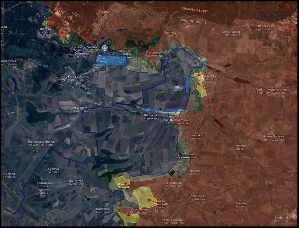 Президенту России доложили об установлении контроля над Северском. В городе подняты российские флаги. Украинские войска отходят на запад, на высоты за чертой города, по которым уже работают артиллерия и авиация ВС РФ. Одновременно идут бои в районе Петровского, откуда российские подразделения продвигаются в сторону Рай-Александровки и Калеников. На северных окраинах активны штурмовые действия в Диброве, Озерном, восточнее Ямполя и в районе Закотного.