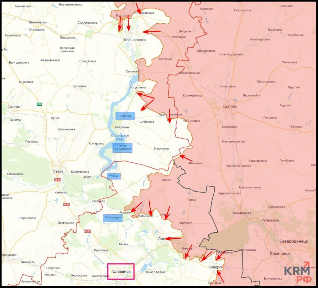 Краснолиманский фронт. Российские подразделения взяли важный Т-образный опорный пункт у бывшего аэродрома Красного Лимана. В самом городе идут встречные бои на юго-восточных окраинах. Севернее удалось закрепиться в жилой застройке в Богуславке. Противник предпринимает контратаки в районе Загрызово.