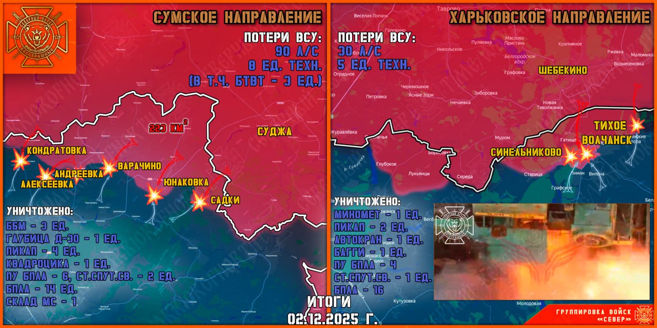 На Харьковском направлении завершается зачистка Волчанска, продолжается эвакуация гражданского населения. В Вильче бои идут в центральной части села, российская авиация наносит удары по позициям ВСУ. Есть продвижение в районе Лимана, однако у Липцев ситуация остается стабильной.