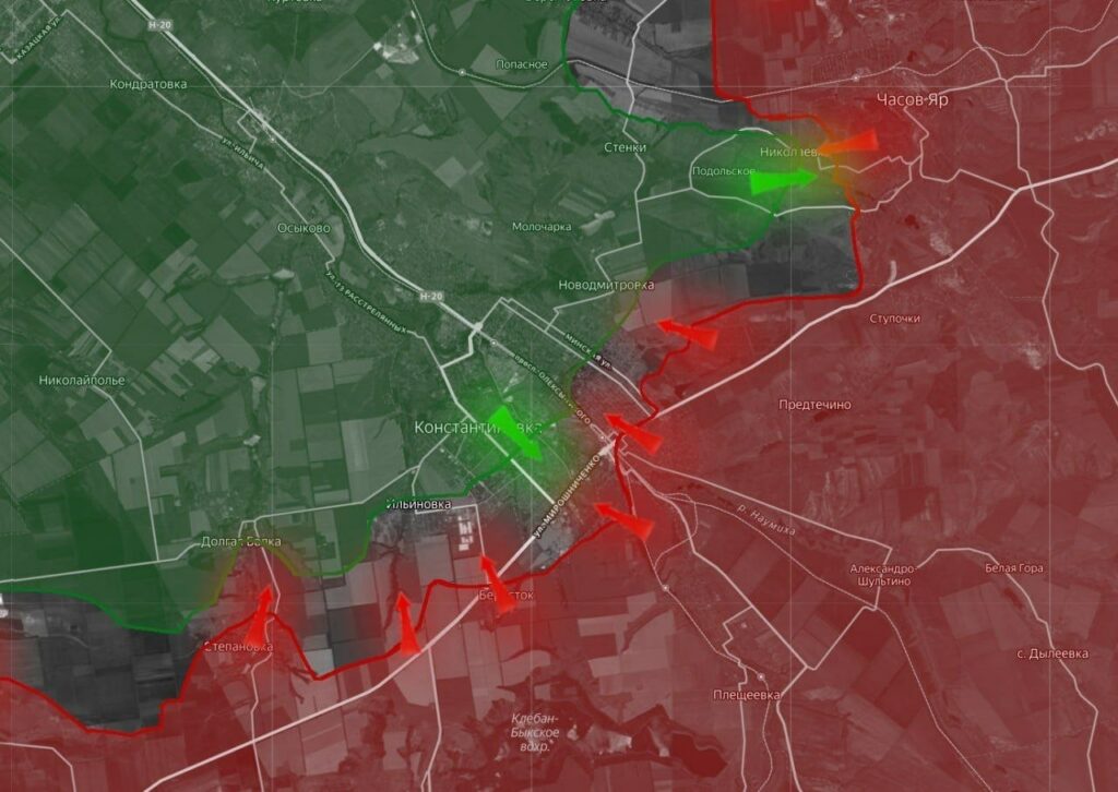 На Константиновском направлении ВС РФ продолжают вести тяжелые бои как в самом городе, так и на его флангах. Восточнее ВСУ удерживают окраины Часова Яра, без контроля над которым невозможен охват Константиновки с северо-востока.
