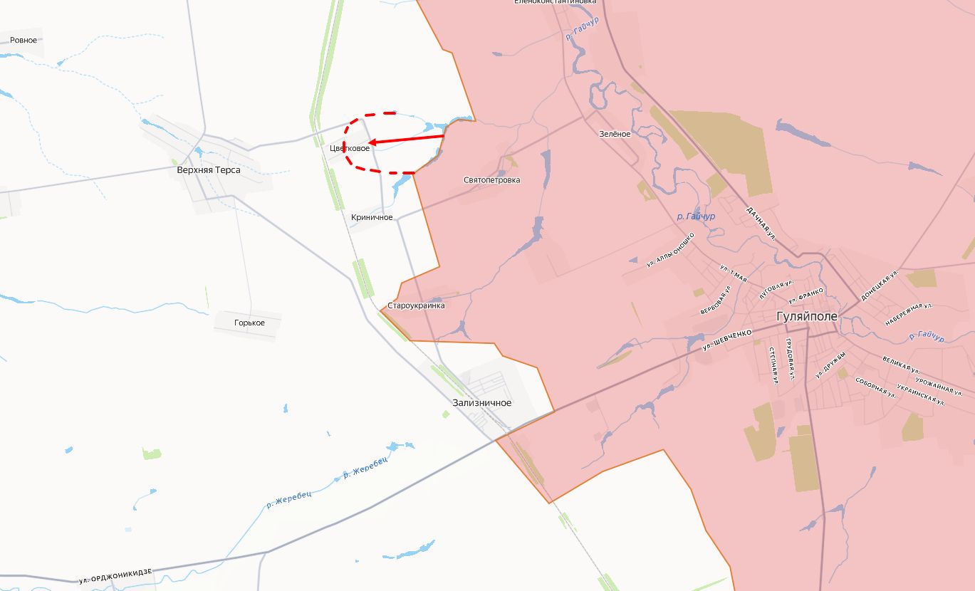 На гуляйпольском направлении зафиксировано дальнейшее расширение зоны контроля российских войск. Подразделения группировки «Восток» сумели прорваться в населённый пункт Цветковое, тем самым укрепив и углубив плацдарм, сформированный ранее. Движение подтверждается материалами объективного контроля, что указывает на устойчивый характер продвижения, а не локальный рейд.