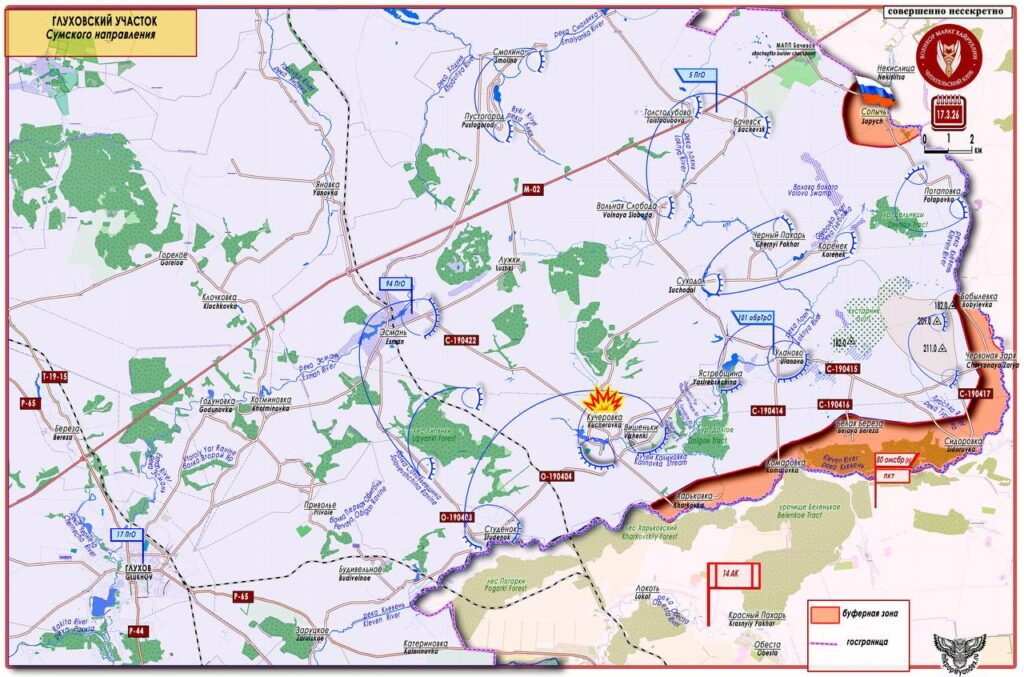На севере Сумской области (условно Глуховский участок) продолжаются боевые действия в приграничной полосе, 17 марта был установлен контроль над н.п. Сопычь (51°50′54″ с. ш. 34°21′43″ в.д. — население в 2025 году 22 чел.). Расположен данный населенный пункт на правом берегу р. Клевень, по руслу которой проходит государственная граница с РФ. В населенном пункте находится военный городок в/ч 9953 госпогранслужбы Украины ( 5 Сумской погранотряд бригадного уровня). Здесь был оборудован пограничный переход, который находился в зоне ответственности Сумского пограничного отряда. В 2018 году распоряжением правительства Украины погранпереход был закрыт.