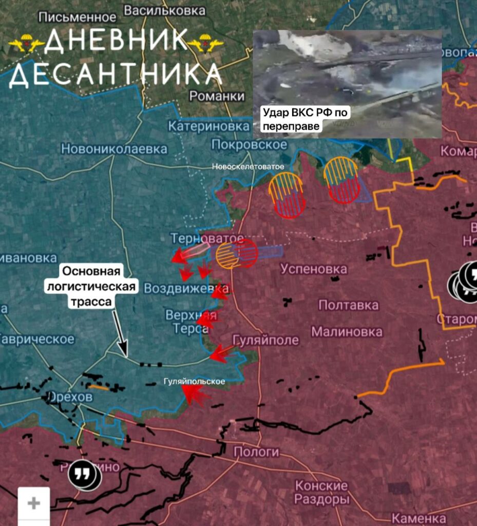 От Цветкового продвигаемся к Верхней Терсе, а южнее есть успехи у Гуляйпольского, где наши войска в ходе атакующих действий от Мирного, приближаются к селу. ВСУ задействуют основную логистическую трассу Омельник-Зализничное с тремя мощными укрепрайонами в районе Новосёловки, сама трасса находится в низине, в то время как с Южной и восточной сторон у нас преимущество на высотах, противника спасает только высота севернее, — Дневник Десантника.