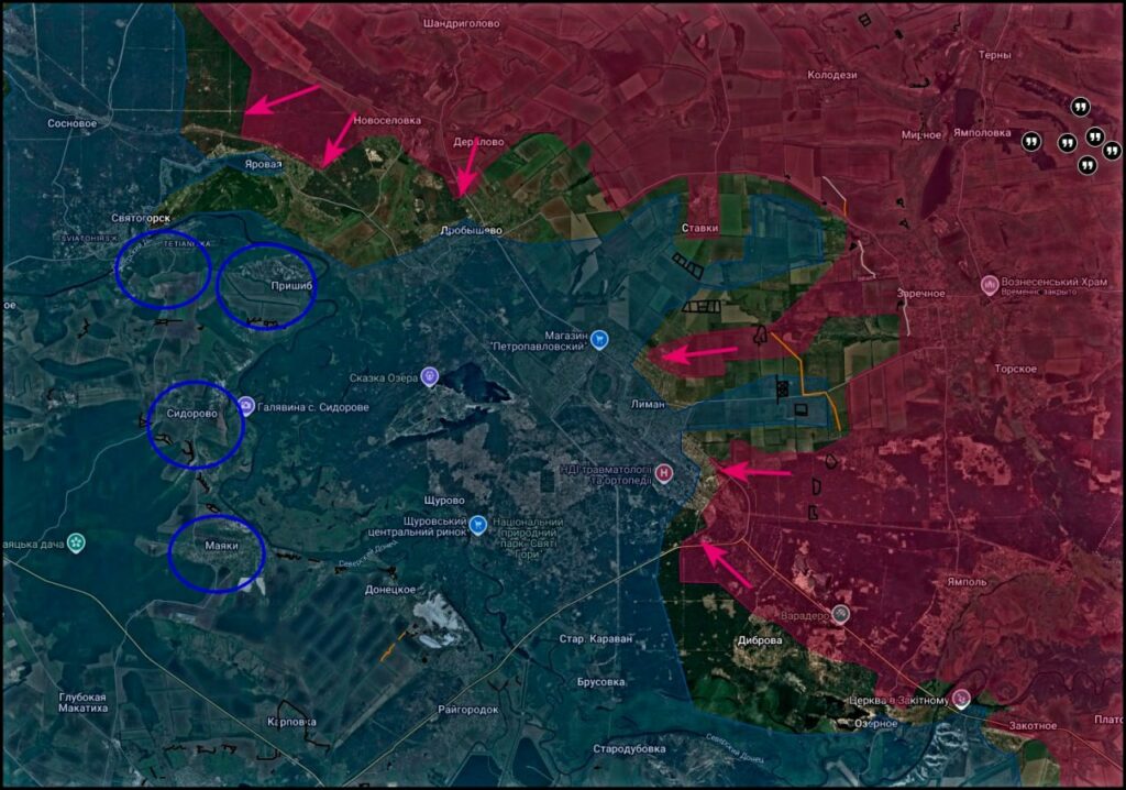 Штурмовые действия по Красному Лиману ограничены окраинами и малыми группами. Масштабного наступления пока нет. Обороняться противнику здесь удобно — подходы простреливаются, передвижения хорошо видны, — KRM РФ.