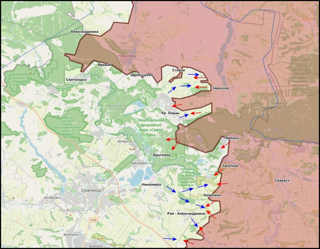 Бои уже перекинулись в населённые пункты — Боровая, Святогорск, Студенок, Старый Караван. Канал «Клик» сообщает: российские силы продвинулись примерно на два километра, закрепившись восточнее Рай-Александровки.