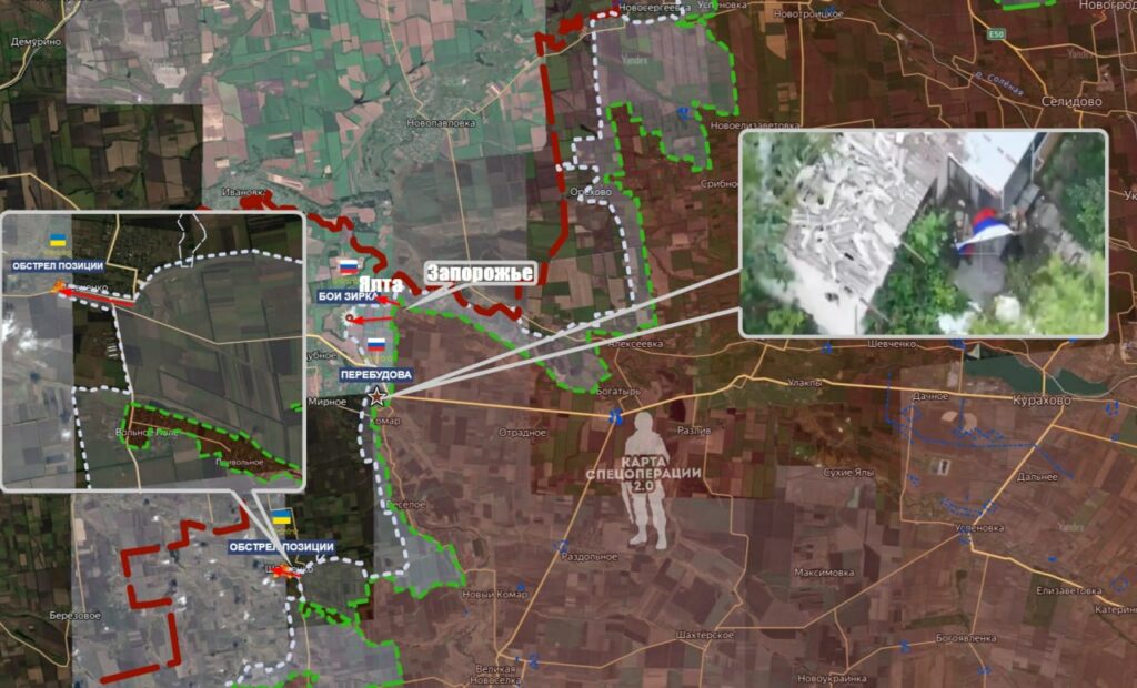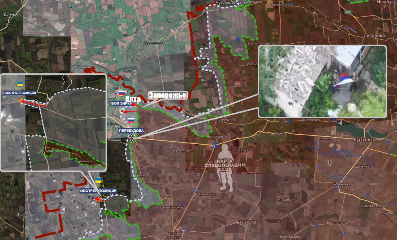 Взяв под контроль село Комар, наши военные освободили смежное с ним село Перебудова. На карте — кадр из видео с демонстрацией Флага Российской Федерации на правом берегу р. Мокрые Ялы.