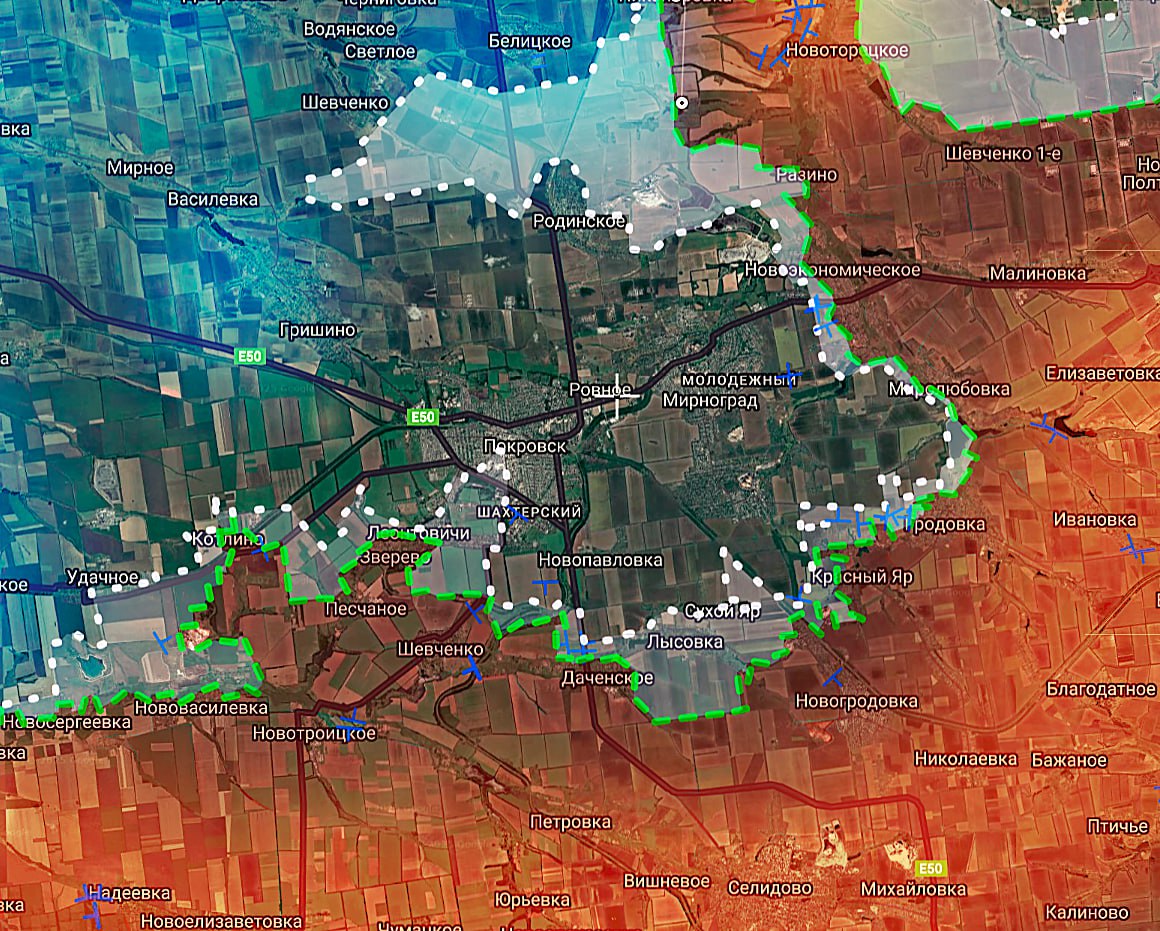Российские силы формируют полукольцо с запада и севера. Основная цель — перерезать трассу на Павлоград и дороги через Родинское, что приведёт к частичной или полной изоляции города. В такой конфигурации ВС РФ смогут не прибегать к лобовому штурму: достаточно блокировать каналы снабжения и эвакуации, после чего приступить к систематическому давлению на гарнизон с применением артиллерии, авиации и дронов, — Донбасский Партизан.