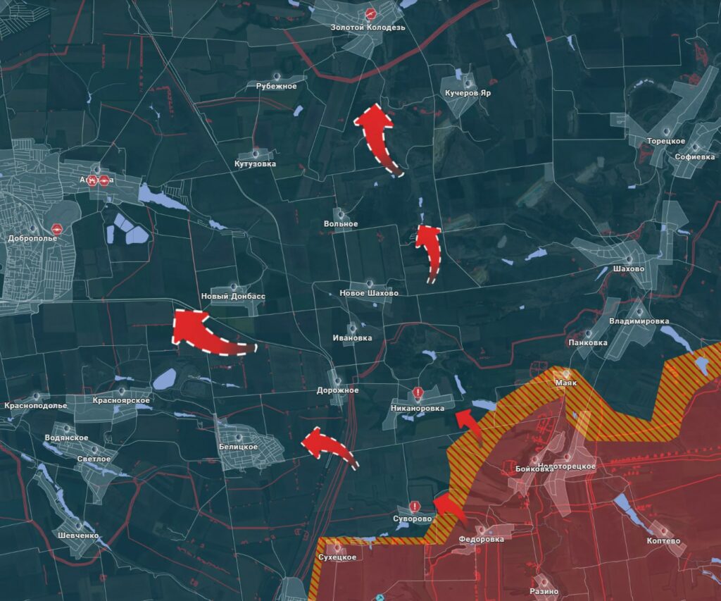 ВС РФ полностью освободили Первое Мая и продвигаются на запад, стремясь выйти к Покровску (Красноармейску) с фланга. Это позволит атаковать город с юго-западного направления, минуя основные укрепления. В районе Родинского продолжаются активные боевые действия, что подтверждает попытки российских сил закрепиться на высоких рубежах и обеспечить контроль над подходами к городу.