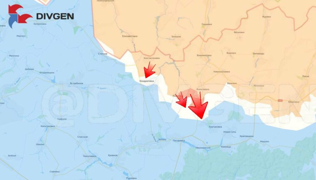 Продвижение идёт и в Запорожской области. Там российская армия расширяет зону контроля в районе Малокатериновского лимана в Приморском. Речь идёт о южном береге реки Конка на месте её впадения в Днепр (Каховское водохранилище), — Южный фронт.
