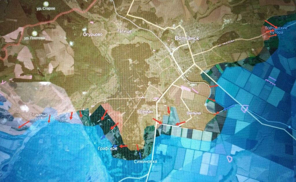 Подразделения ГрВ «Север» продолжают развивать наступление южнее и восточнее Волчанска. ВС РФ «подвинули» противника в Волчанских Хуторах со стороны западной части и с севера (со стороны Тихого) на ул. Чигринова. Половина села — за нашими подразделениями, а также отделение почты, район кладбища и почти вся ул. Н. Парасола.