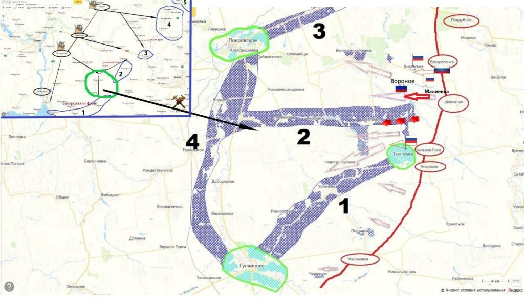 На Запорожском участке, в Степногорске, идут ожесточённые бои за его южную часть. В Приморском уничтожена ж/д станция, которую противник использовал как укрепрайон. До города Запорожья от нынешней линии фронта — около двадцати километров. На восточном фасе направления армия России от Марфополя вышла на юго-восточную окраину Гуляйполя. Пока неизвестно, удалось ли нашим там закрепиться. За прошедшие сутки Армия России продолжила наступательные действия на рубеже Работино-Вербовое. Бойцы 1430 гвардейского полка 58-й гвардейской общевойсковой армии нанесли поражение силам ВСУ южнее Новоданиловки.