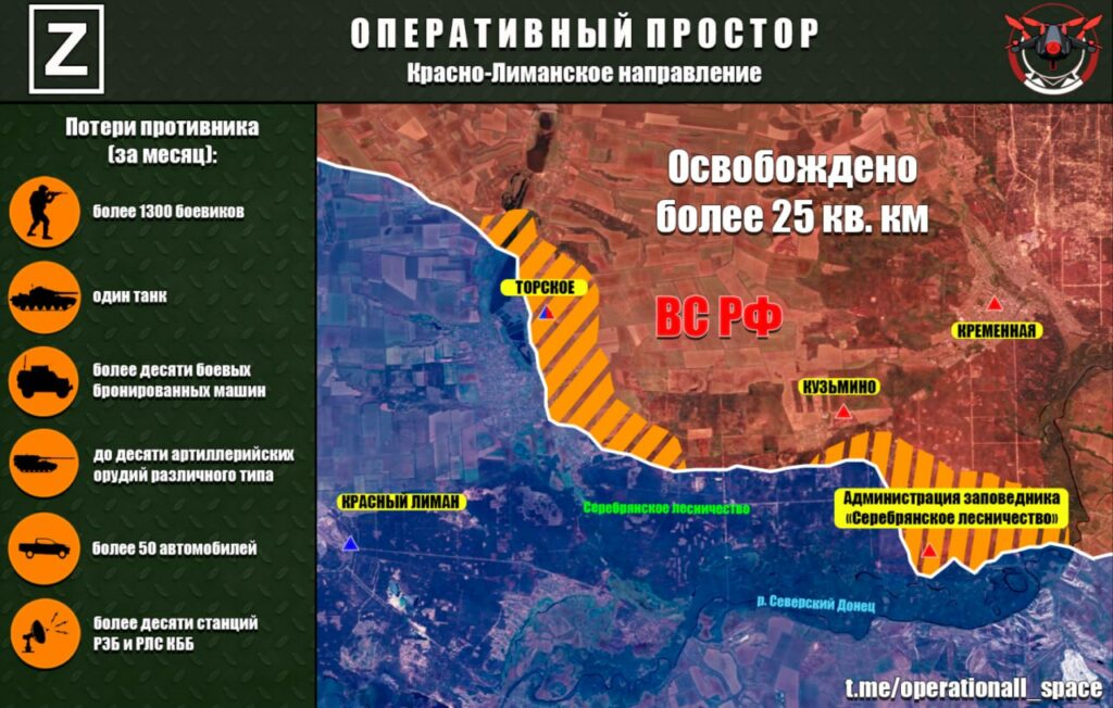 ВС РФ в течение июля освободили более 25 кв. км территории. ГрВ «Запад» продолжает активные наступательные действия в Серебрянском лесничестве, сосредотачивая основные усилия на взятии под контроль н.п. Торское и блокировании противника вдоль реки Северский Донец, — Оперативный простор.