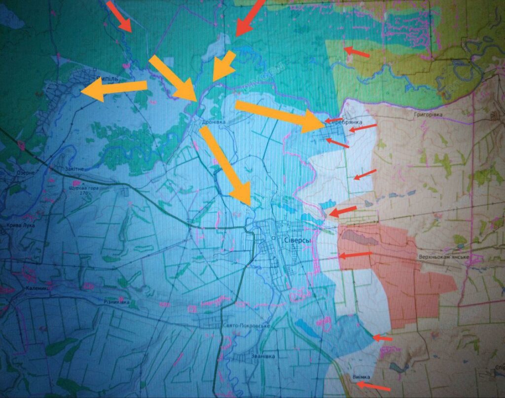 На юго-восточных подступах к Северску ВС РФ атакуют в районе Выемки и от занятого накануне крупного опорного пункта (западнее Ивано-Дарьевки) по высотам, спускаясь к южным окраинам Северска.