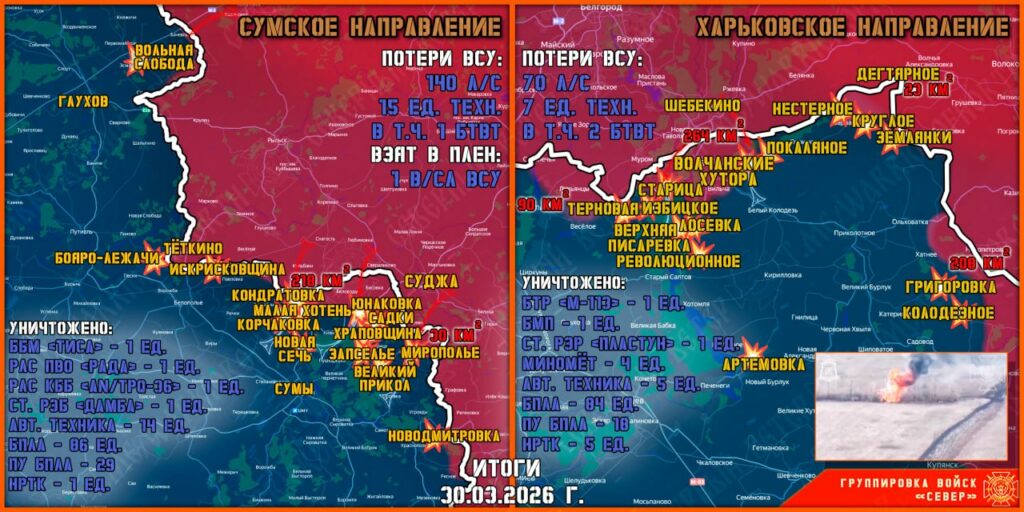 В Сумском приграничье ВС России продвинулись примерно на 600 м в Сумском и Глуховском районах. В Краснопольском районе продвинулись на 800 м. Штурмовики ГВ «Север» продолжают вести ожесточенные бои, продвигаясь вглубь Сумской области. Наши войска нанесли удары по скоплениям живой силы и техники противника в районах Искрисковщины, Кондратовки, Великого Прикола, Мирополья и села Новая Сечь. Штурмовые группы Северян в ходе упорных боев продвинулись в Сумском районе на четырнадцати участках и в Глуховском на четырех. За сутки продвижение составило до 400 м.