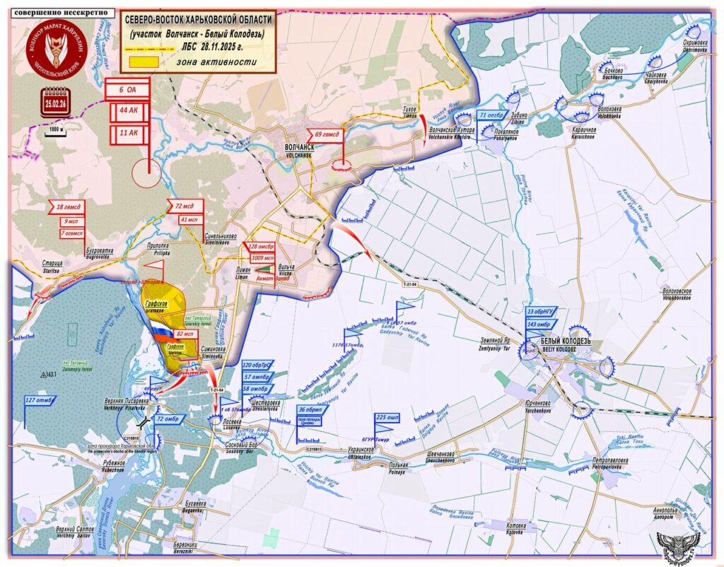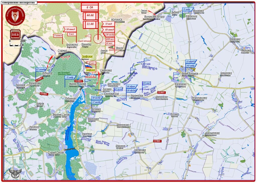 К вечеру 26 февраля боевые действия продолжаются сразу на нескольких участках линии соприкосновения. Наиболее напряжённая обстановка складывается на Добропольском направлении, где идут бои за населённые пункты Гришино и Удачное, а также в районе Кучерова Яра. Одновременно сохраняется позиционное противостояние на Херсонском направлении и продолжается продвижение подразделений в Харьковской области вдоль реки Северский Донец.