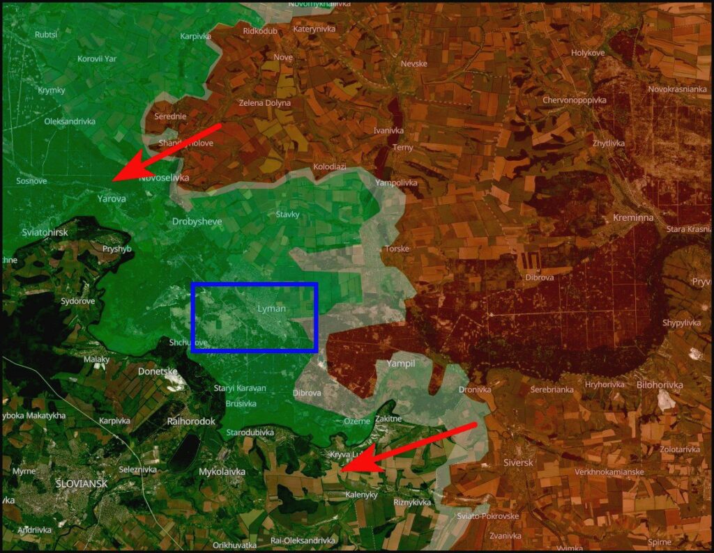 Уничтожение переправ через Северский Донец принесло результаты: логистика ВСУ в городе сильно осложнилась, что дало возможность подойти к городу и с востока, начав (2) штурмовые действия на востоке Красного Лимана. Активно развиваем наступление в сторону ж/д станции Зеленый Клин и к Центральной больнице, бои доходят до улицы Советской (Слобожанская). С юго-восточной стороны Красного Лимана взяли под контроль Т-образный перекресток. — Дневник Десантника.