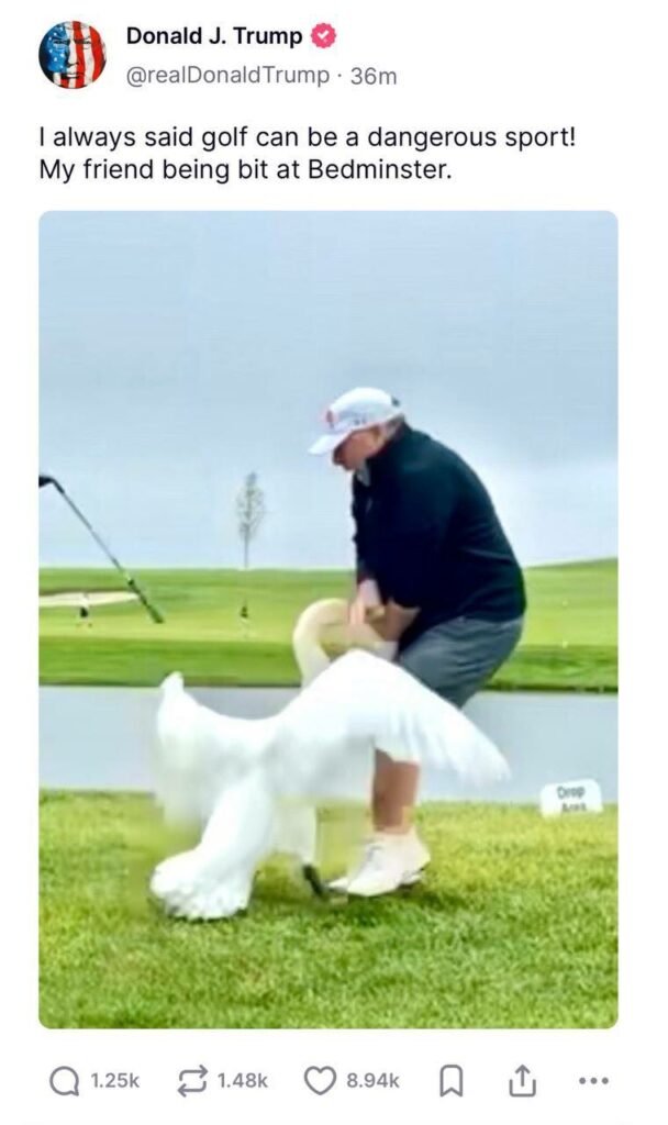 Сегодня в поместье Дональда Трампа в Нью-Джерси произошёл необычный случай. Во время игры в гольф лебедь неожиданно укусил спецпосланника США по вопросам Украины и Ближнего Востока Уиткофа в весьма неловкое место. Сам Трамп, который проводит там выходные, рассказал об этом и даже поделился фото с инцидентом, назвав происшествие опасным, но забавным.